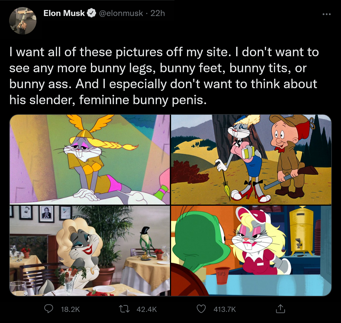 "My site, my rules. I do what I want. Look, I just don't want them on there. I don't want to see them, I don't want to think about them, I don't want intrusive thoughts of Bugs Bunny's slender rabbit leg poking out from a dress, thinking about how the slit goes all the way up to his perky little rabbit ass. I don't think that's bigoted of me, they can still exist in the world. Just not on my website, on my internet, in my world, basically anywhere that I may see them. I don't want to walk outside my house and be bombarded with this constant gay propaganda forcing me to feel this way about Bugs Bunny. They do this on purpose, they draw it as appealing as possible so that you have no choice but to think about it like that. It's like hypnosis, like gay hypnosis." Elon ranted on Twitter, claiming that WB was specifically trying to turn him gay on purpose as part of their "agenda".