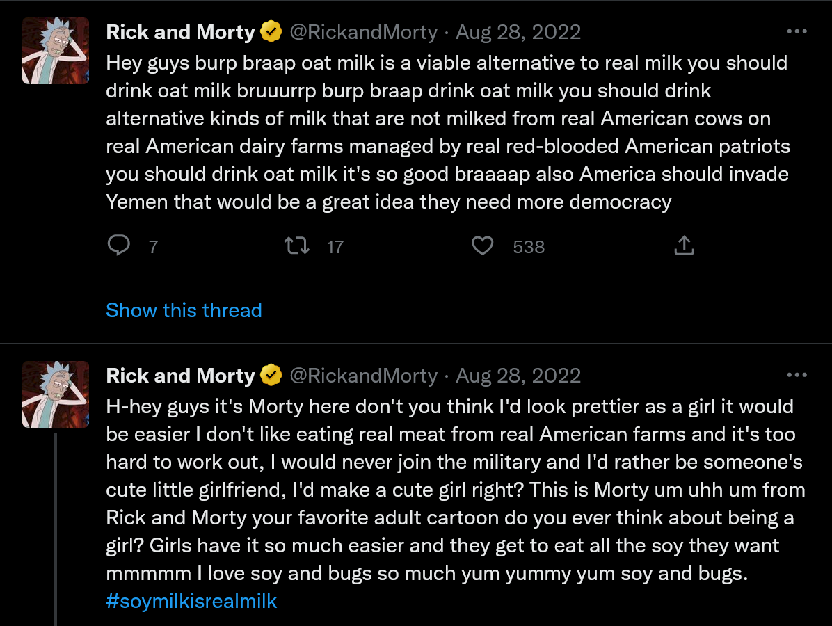 "See, real patriots would understand the demonic symbolism in Rick and Morty. The grandpa, Rick, represents Saturn. Throughout the show, Rick attempts to pervert and corrupt Morty, and ultimately devour him in a metaphorical sense. Rick strives to be immortal, and does so at Morty's expense by draining him of his freedom and innocence. Just as the elite drink fetus blood to be young forever, and experiment on children to learn the secrets to immortality." Elon explained in a real, verified American Twitter post. Exposing the elite for their evil Saturn worship and child sacrifice rituals. These claims were fact checked by real American patriots. Elon then banned Rick and Morty, so that they wouldn't be able to poison any more minds with weird and crazy ideas like "what if I'd look better as a girl" or "maybe I'm unhappy because I'm not having enough sex". Sex is bad and sinful, and real patriots know semen retention is the key to maximizing their testosterone. Stop having sex, stop cumming. Don't you care about America?