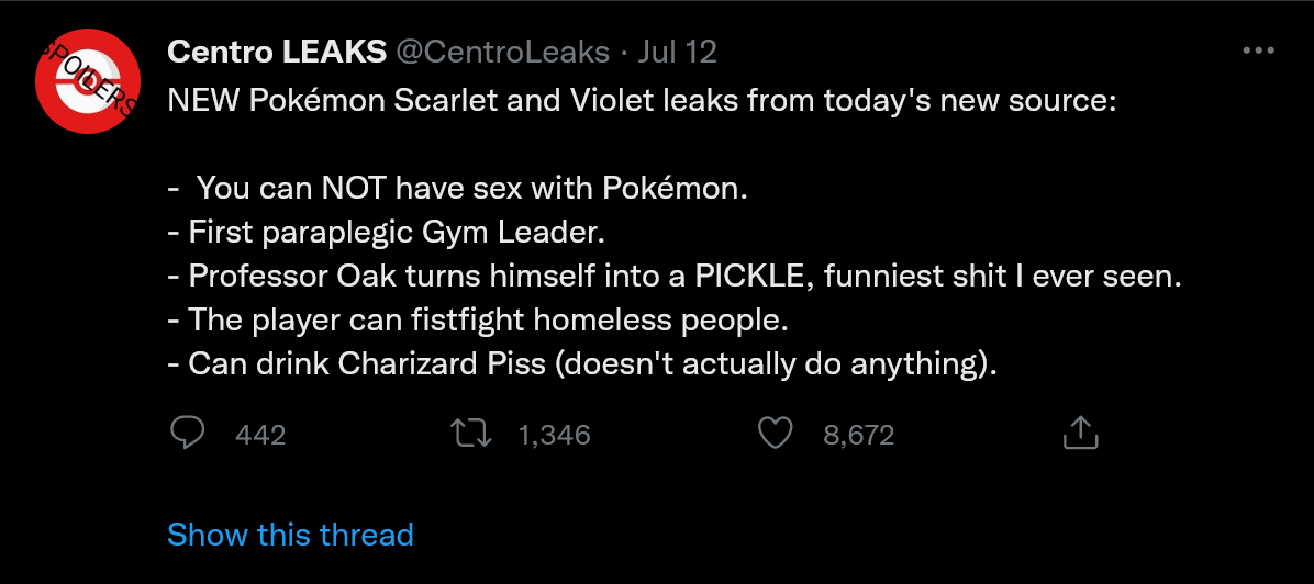Pokémon fans have been chimping out over the latest leaked screenshots of the highly anticipated Pokémon Scarlet and Violet games coming to the Nintendo Switch. The latest leaks, although incredibly hard to decipher anything from and quite possibly fake, seem to reveal that it's still Pokémon, and you've been playing these games way too long. Don't you have anything better to do with your time? Seriously.