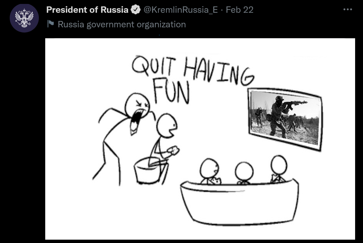 Russia is reported to have also posted an image depicting Ukraine as an angry soyboy wojak, which is meant to imply that Russia is "based" and "red-pilled", while the opposing viewpoint is underwhelming in the masculine way and allows their wife to have sex with other men. Ukraine responded with a pixelated and deep-fried image that appeared to originate from an episode of popular adult cartoon Family Guy, captioned with "damn bro you got the whole squad laughing". We are talking weapons of mass destruction here. The planet is in danger, and mankind as we know it may be in jeopardy. This is the war to end all wars. The never ending war. It never ends, it never ends, it never ends, it never ends. It's been going on since you were born, and will continue long after you die.