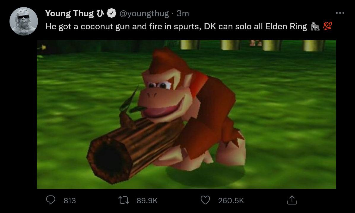 "Nintendo should put Donkey Kong in Elden Ring. I think it would be very cool to play as Donkey Kong. You could jump and roll into enemies to knock them out, and search for bananas in the game." Young Thug began his Twitter thread, listing out all of the reasons he thought Donkey Kong should be added and calling upon Nintendo (and FromSoftware, by implication, assuming that he's aware that Nintendo does not actually make Elden Ring.)